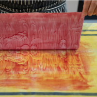 Rekonstruktion „Kleisterpapier in Abzugstechnik“: Kleisterpapier wird vom Wachstuch gezogen. Rezept aus: Thon, Ch. F. G. (1826) Der Fabrikant bunter Papiere (Rekonstruktion Charlotte Maier, Foto: Junya Keller 2018).