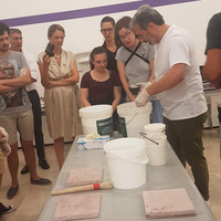 Einer der wichtigsten und wahrscheinlich auch eindrücklichsten Aspekte der Summer School war jedoch die Annäherung von der praktischen Seite. Der Stuckateur Giovanni Nicoli erklärte die Eigenschaften der verwendeten Materialien sowie die Abläufe und zeigte seine Tätigkeit. Und auch die Studierenden konnten selbst ein Probestück ausführen (Vgl. Abb. 7-12). Es war faszinieren, welch grosse Rolle das Materialwissen des Profis und – man kann es wirklich nicht anders nennen – das embodied Knowledge spielten.